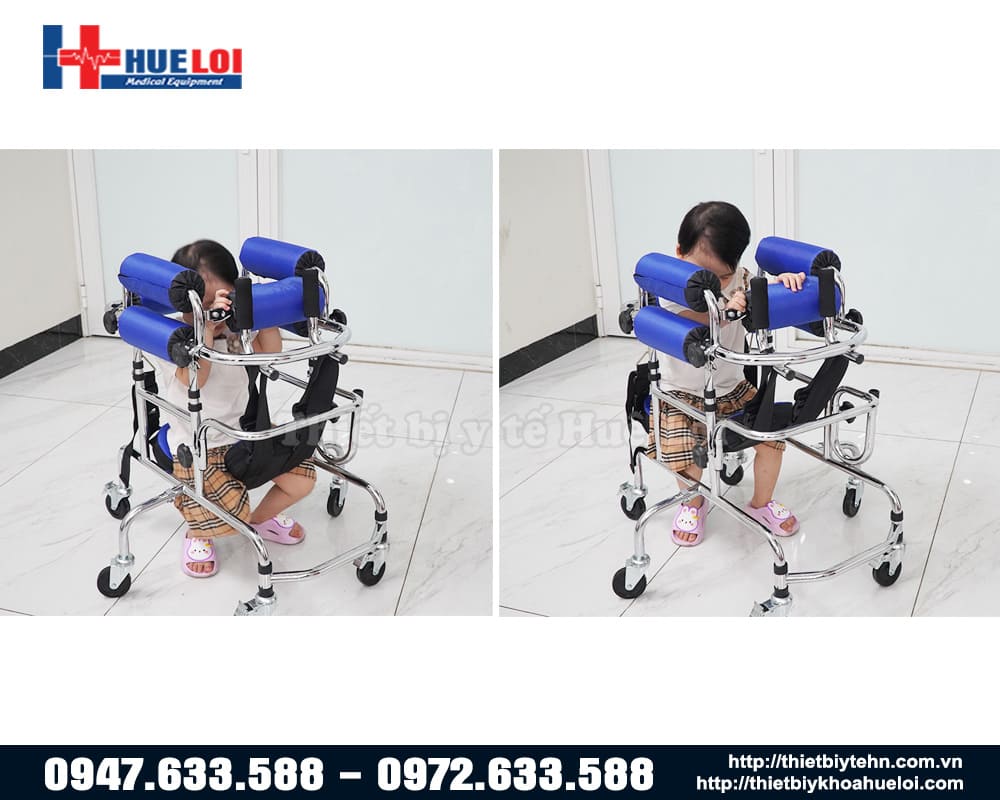 Khung tập đi cao cấp cho trẻ em liệt nửa người hoặc liệt 2 chi dưới do bại não, chậm phát triển tâm thần vận động, di chứng viêm màng não, viêm não Nhật Bản, viêm não virus...có thể tập đi tại nhà từ đó góp phần phục hồi khả năng đi lại cho trẻ.
