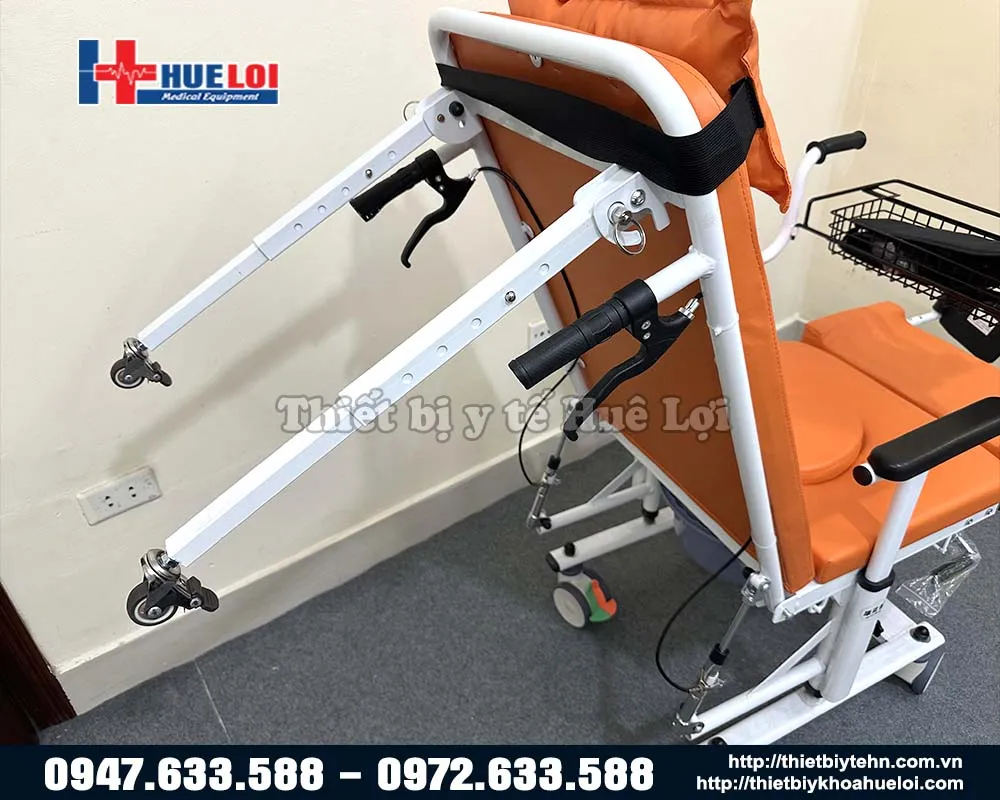 • Phần ngồi có thể ngả xuống 180 tạo thành 1 Chiếc giường để đưa bệnh nhân lên xe dễ dàng hơn.