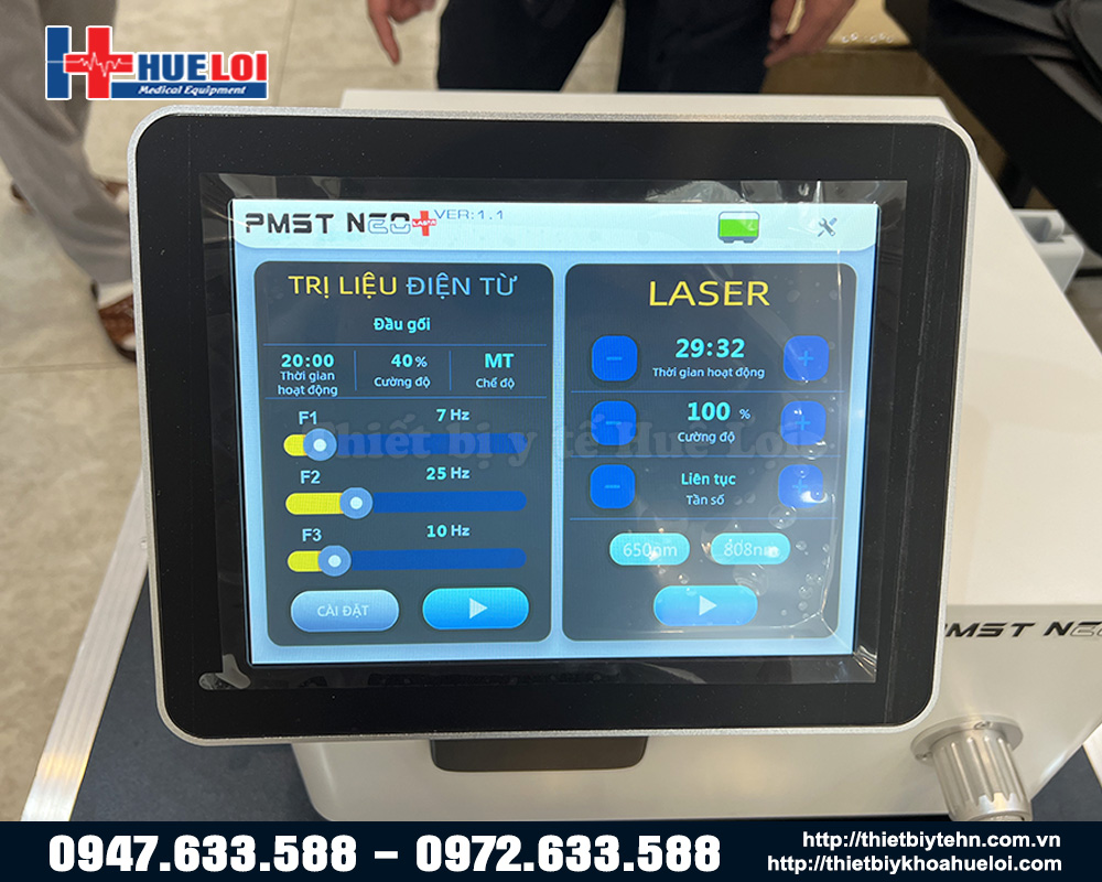Máy từ trường siêu dẫn có laser lạnh PMST 4 NEO + là phiên bản cao cấp hơn của PMST 4 NEO, máy sử dụng laser lạnh với bước sóng 650nm và 808nm thay vì dùng hồng ngoại. Điều này giúp máy có thể tác động sâu hơn, hiệu quả hơn so với phiên bản thông thường. Ngoài ra, máy có mức công suất từ trường siêu dẫn lớn hơn (5 Tesla) cùng hệ thống tản nhiệt nước và công suất tối đa máy lên đến 1500W giúp cho PMST 4 NEO + là lựa chọn rất đáng đầu tư trong phân khúc máy từ trường 2 trong 1.