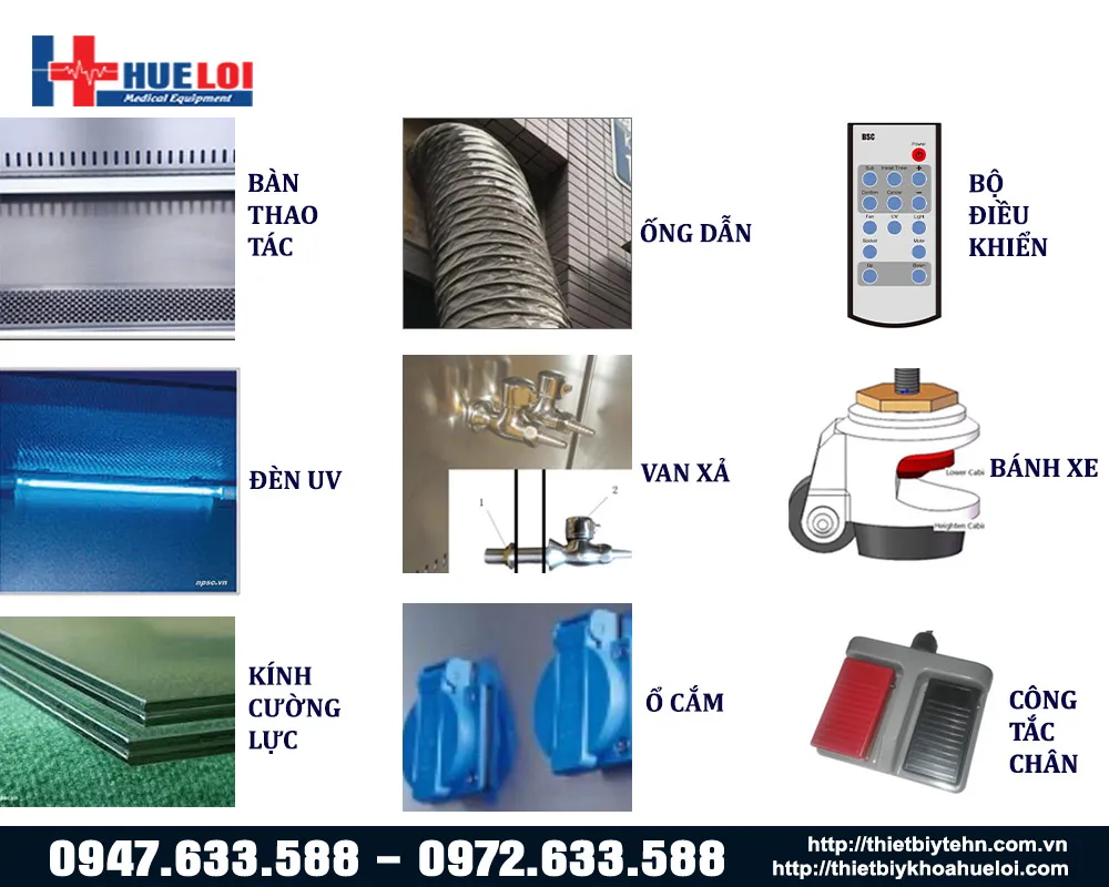 Đèn LED; đèn UV; chân đế; điều khiển từ xa; công tắc chân; van xả; ổ cắm chống nước |